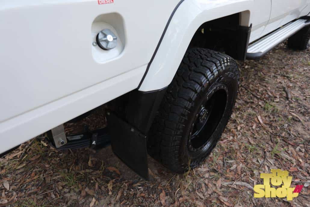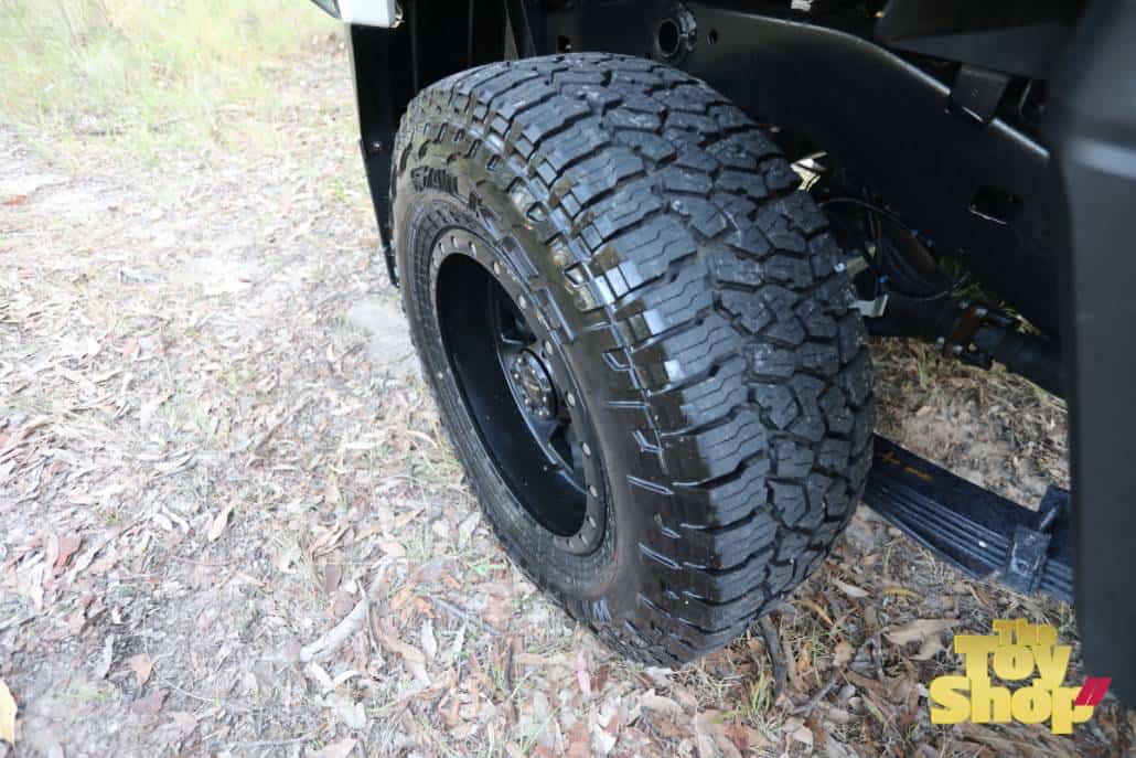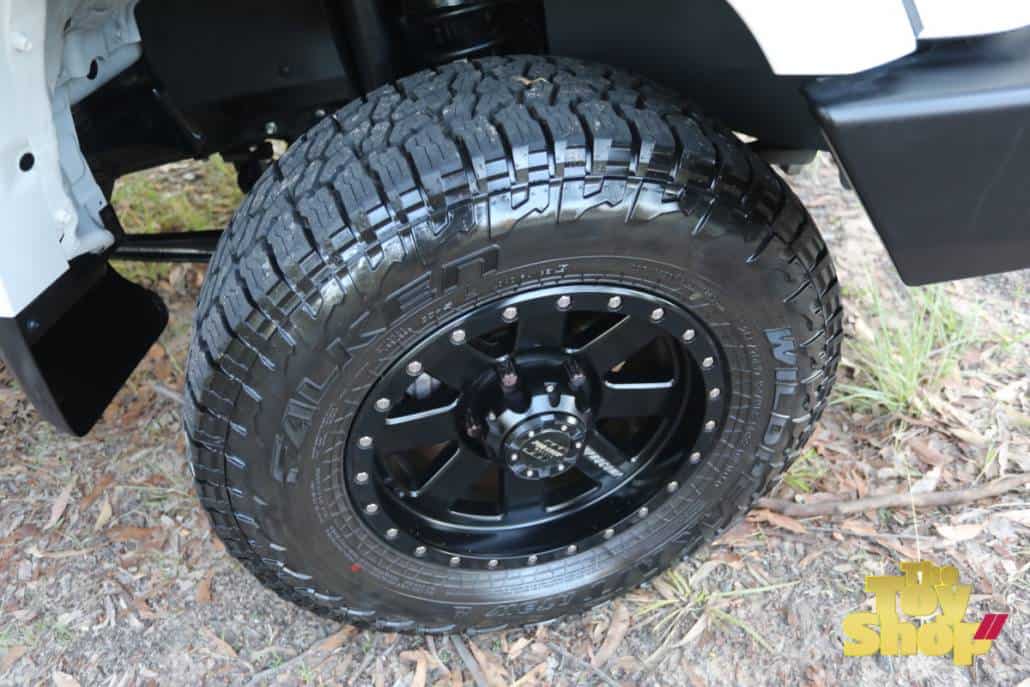 – PROCOMP black 17″wheels with alloy wheels with staggered offset on rear to correct the track.  285/70/17 Falken Wildpeak AT’ tyres